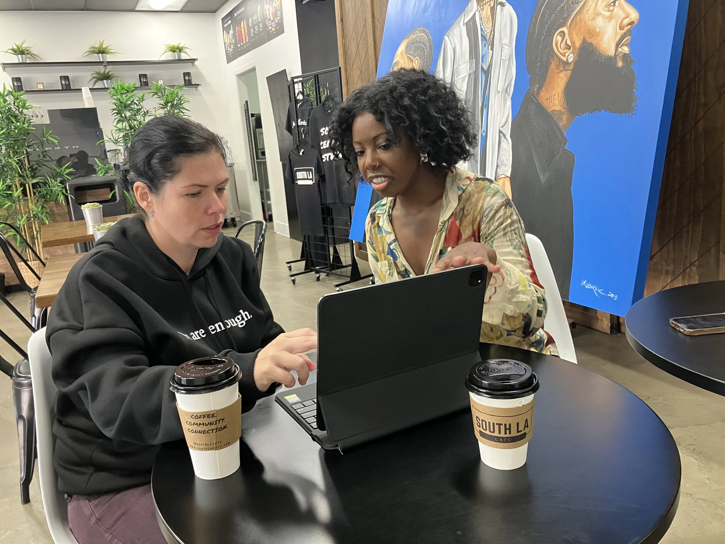 Photo of Tori Hobson with client taking an informed trauma design quiz